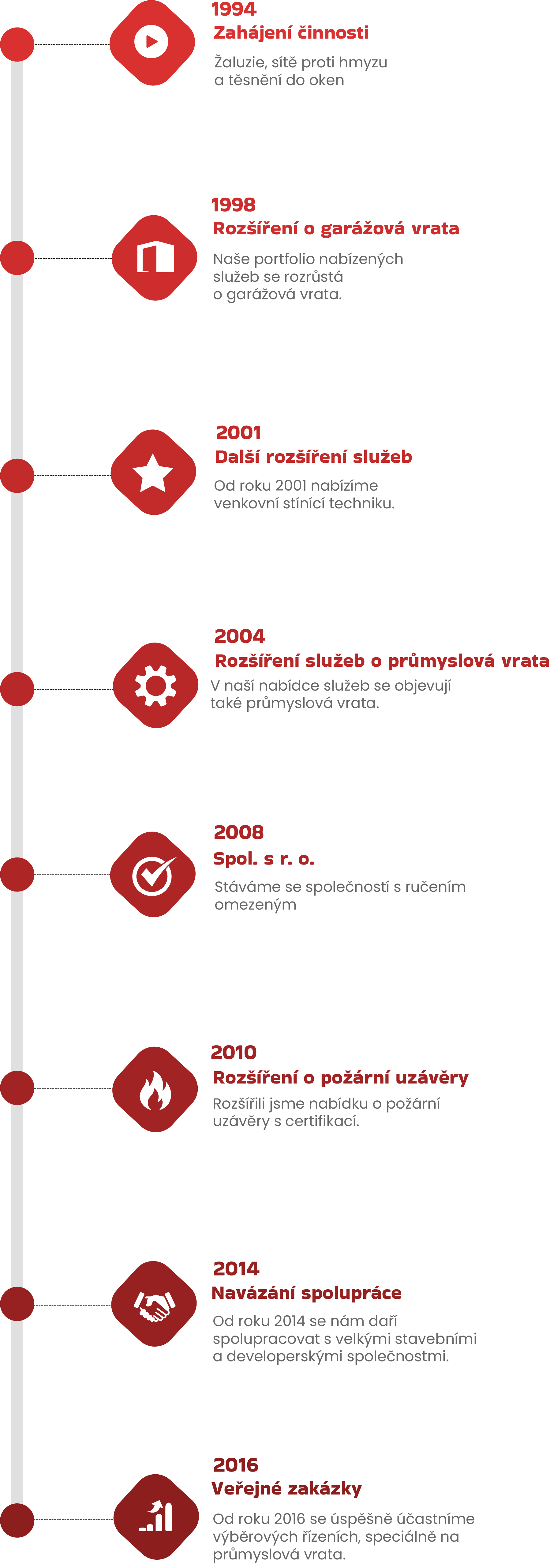Působíme na trhu již od roku 1994. Hlavní činností jsou dodávky a montáže garážových a průmyslových vrat a stínící techniky.